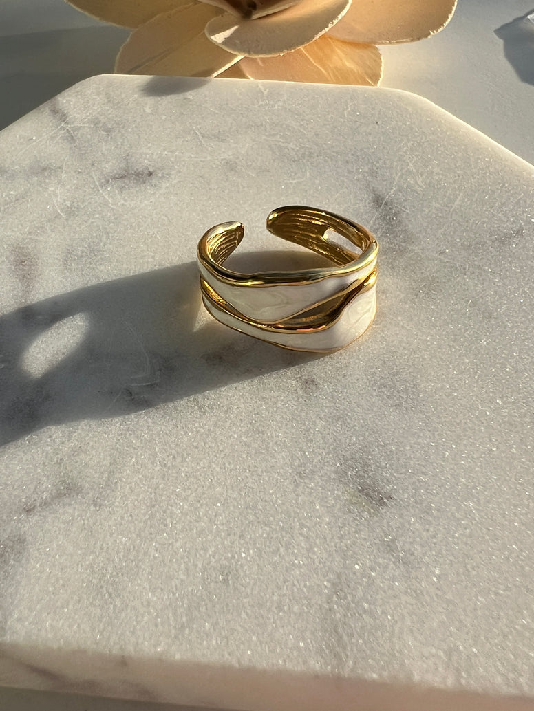 Introducing the Gemma Ring, crafted from 18k gold plated stainless steel and finished with beautiful white and grey enamel. This sophisticated ring is perfect for adding a bold touch to any outfit. Perfect for the office or day-to-night looks.