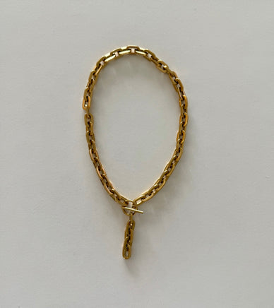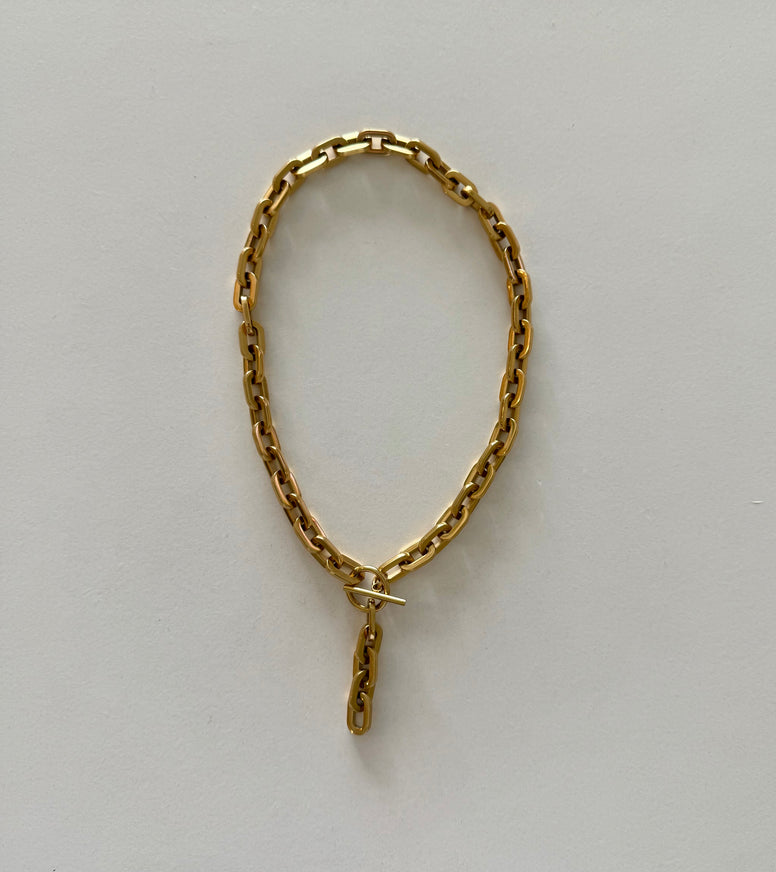 This stunning necklace boasts a chunky 18k gold stainless chain link design and a toggle clasp at its center, making it the perfect statement accessory.