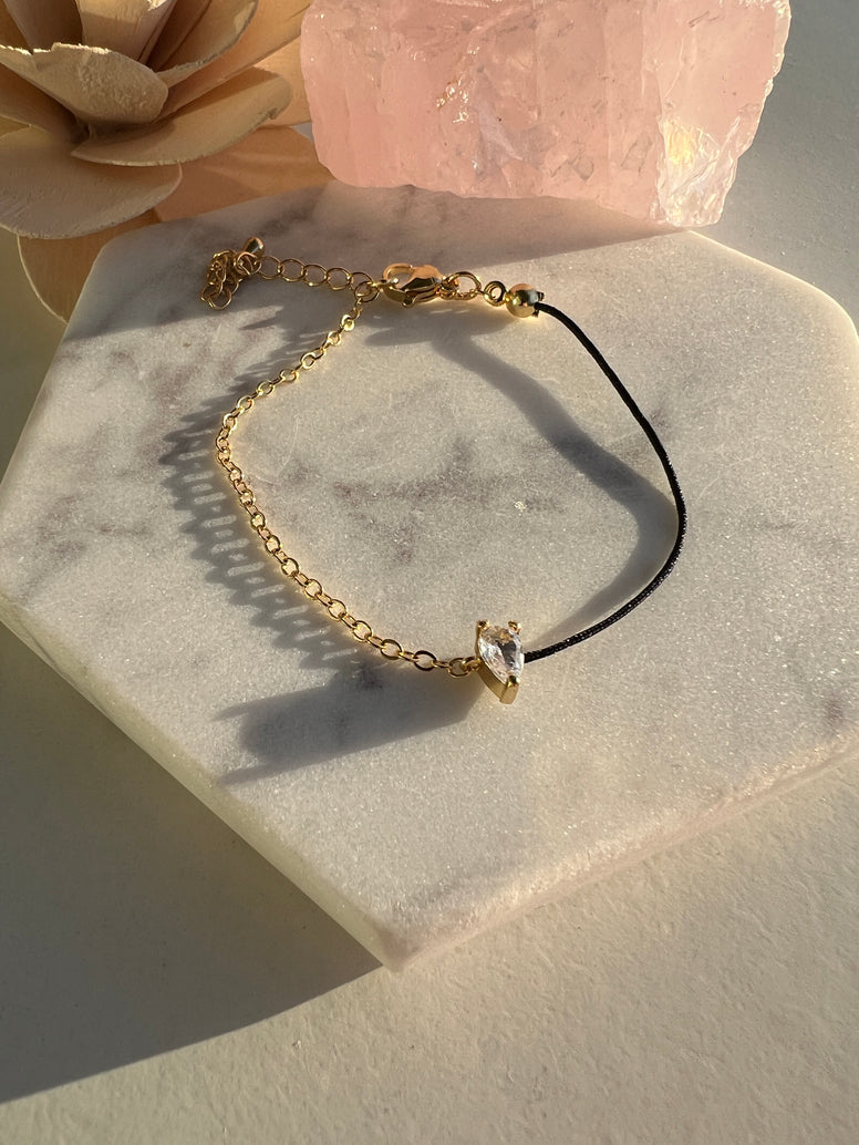 Elevate your style with the Kensi Bracelet, a modern and chic accessory crafted from 14k gold-plated stainless steel chain. Choose from four vibrant nylon string options in blue, pink, white, or black, each adorned with a stunning crystal accent in either a teardrop or emerald shape.