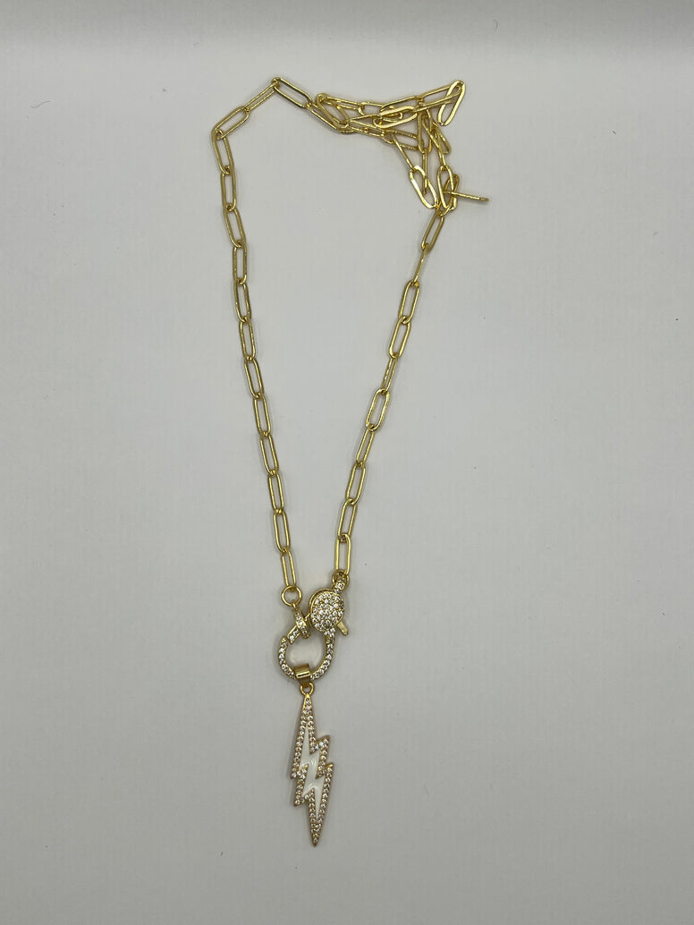 This 14k gold filled paperclip chain pendant adds an extra dimension of texture and style with a micro-pavé lobster clasp that adds a touch of sparkle and glamour. The lightning bolt charm comes in black or white with micro-pavé accents adding a playful and trendy element. This necklace is perfect for any fashion-forward individual looking to add some sophistication to their everyday wardrobe.