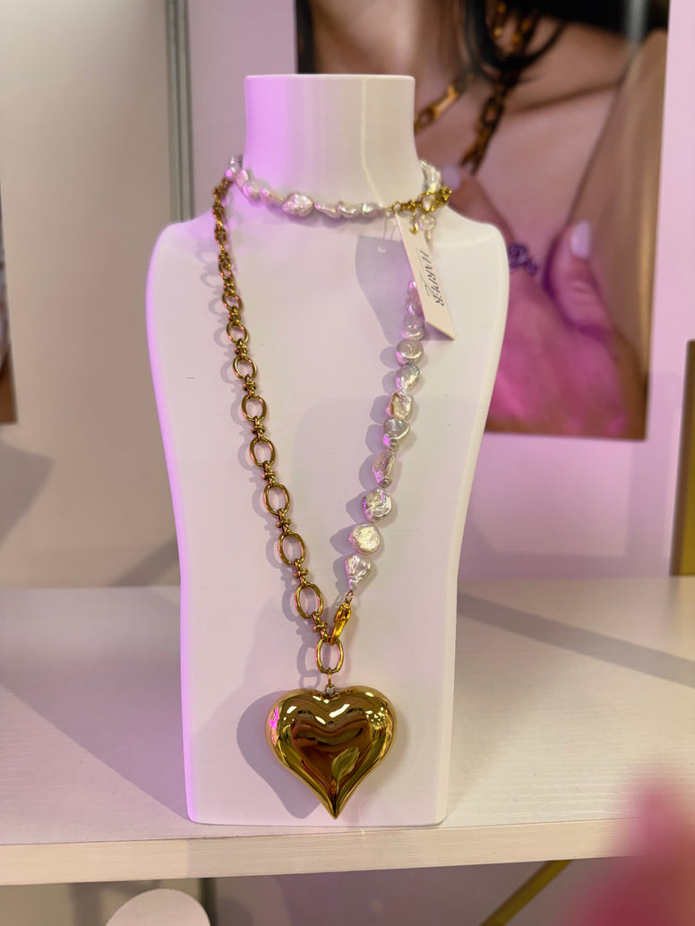This pearl heart chain is 42” in length and crafted with genuine pearls. Its versatility allows it to be worn as two necklaces or even transformed into a belt.